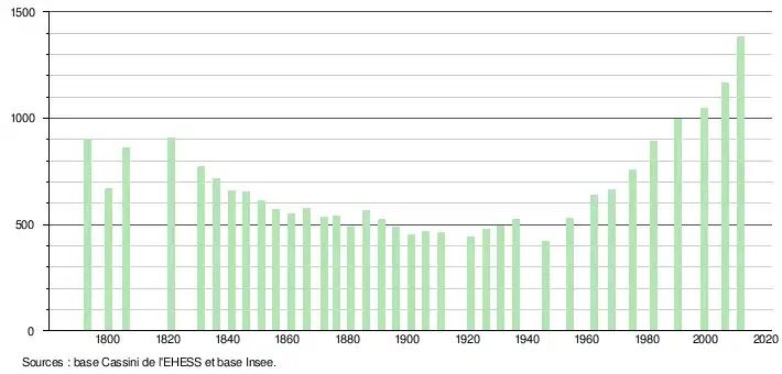 L'évolution du nombre d'habitants est connue à travers les recensements de la population effectués dans la commune depuis 1793. À partir du , les populations légales des communes sont publiées annuellement dans le cadre d'un recensement qui repose désormais sur une collecte d'information annuelle, concernant successivement tous les territoires communaux au cours d'une période de cinq ans. Pour les communes de moins de 10 000 habitants, une enquête de recensement portant sur toute la population est réalisée tous les cinq ans, les populations légales des années intermédiaires étant quant à elles estimées par interpolation ou extrapolation[10]. Pour la commune, le premier recensement exhaustif entrant dans le cadre du nouveau dispositif a été réalisé en 2006[11],[Note 1].