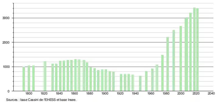L'évolution du nombre d'habitants est connue à travers les recensements de la population effectués dans la commune depuis 1793. Pour les communes de moins de 10 000 habitants, une enquête de recensement portant sur toute la population est réalisée tous les cinq ans, les populations légales des années intermédiaires étant quant à elles estimées par interpolation ou extrapolation[28]. Pour la commune, le premier recensement exhaustif entrant dans le cadre du nouveau dispositif a été réalisé en 2007[29].