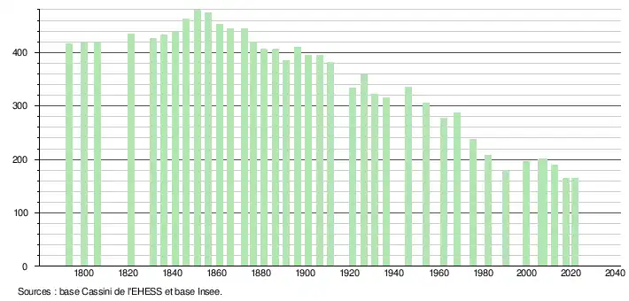 L'évolution du nombre d'habitants est connue à travers les recensements de la population effectués dans la commune depuis 1793. Pour les communes de moins de 10 000 habitants, une enquête de recensement portant sur toute la population est réalisée tous les cinq ans, les populations légales des années intermédiaires étant quant à elles estimées par interpolation ou extrapolation[15]. Pour la commune, le premier recensement exhaustif entrant dans le cadre du nouveau dispositif a été réalisé en 2007[16].