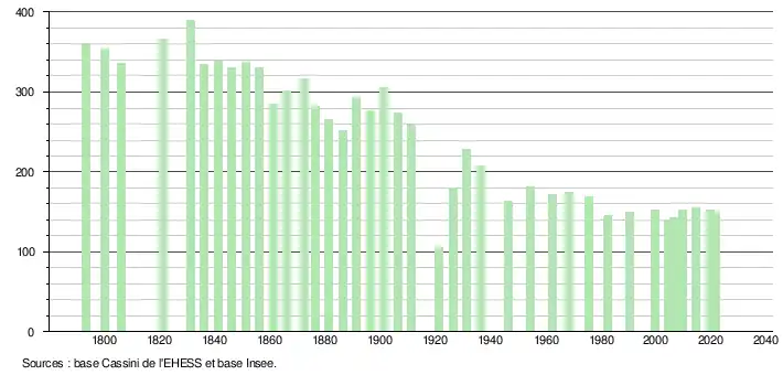 L'évolution du nombre d'habitants est connue à travers les recensements de la population effectués dans la commune depuis 1793. Pour les communes de moins de 10 000 habitants, une enquête de recensement portant sur toute la population est réalisée tous les cinq ans, les populations légales des années intermédiaires étant quant à elles estimées par interpolation ou extrapolation[41]. Pour la commune, le premier recensement exhaustif entrant dans le cadre du nouveau dispositif a été réalisé en 2004[42].