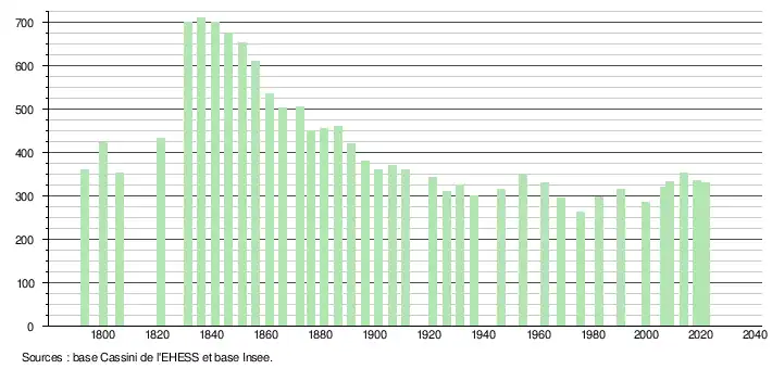 L'évolution du nombre d'habitants est connue à travers les recensements de la population effectués dans la commune depuis 1793. Pour les communes de moins de 10 000 habitants, une enquête de recensement portant sur toute la population est réalisée tous les cinq ans, les populations légales des années intermédiaires étant quant à elles estimées par interpolation ou extrapolation[21]. Pour la commune, le premier recensement exhaustif entrant dans le cadre du nouveau dispositif a été réalisé en 2008[22].