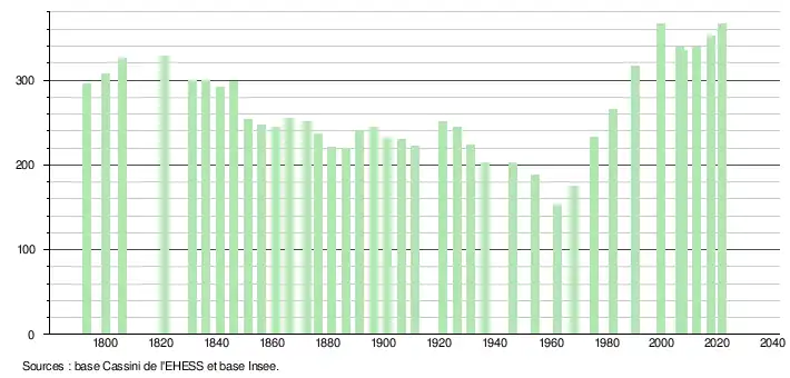 L'évolution du nombre d'habitants est connue à travers les recensements de la population effectués dans la commune depuis 1793. Pour les communes de moins de 10 000 habitants, une enquête de recensement portant sur toute la population est réalisée tous les cinq ans, les populations légales des années intermédiaires étant quant à elles estimées par interpolation ou extrapolation[21]. Pour la commune, le premier recensement exhaustif entrant dans le cadre du nouveau dispositif a été réalisé en 2007[22].