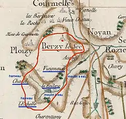 La carte de Cassini ci-dessus montre qu'au XVIIIe siècle, Berzy-le-Sec est une paroisse perchée sur la rive gauche de la rivière de la Crise.