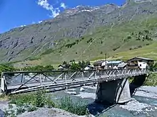 Le pont sur l'Arc est le dernier pont construit à Bessans après la destruction par des crues de plusieurs ponts précédents, le plus ancien connu étant le « pont des Sarrazins », cité en 1522 (alors situé 200 mètres en aval et supposément détruit lors de la crue de 1680)[33]. Construit à la suite de la crue du 13 juin 1957, le pont actuel est un « pont Bailey » composé de planches et d'armatures métalliques. Il possède en son centre un oratoire dédié à sainte Barbe, une tradition sur le pont de l'Arc dont la première mention date de 1806, mais qui ne fut de nouveau respectée qu'à partir de 1970 lorsque l'abbé Ponce fait réaliser un oratoire avant d'y installer la statuette conservée à la chapelle Saint-Jean-Baptiste[33].