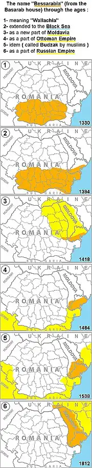 - L'étendue du toponyme régional Bessarabie en tant que région historique d’Europe a évolué au fil des périodes successives valaque, moldave, turque, russe et roumaine[1]