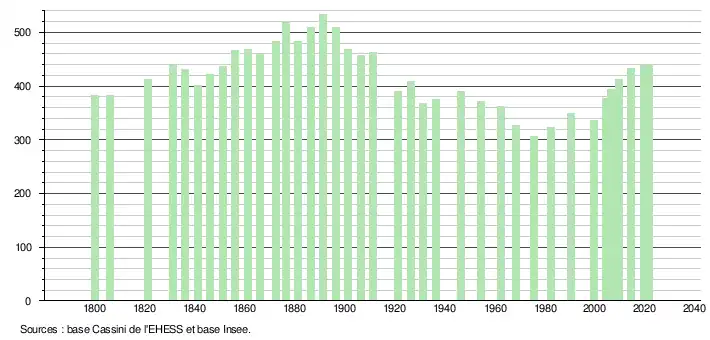 L'évolution du nombre d'habitants est connue à travers les recensements de la population effectués dans la commune depuis 1800. Pour les communes de moins de 10 000 habitants, une enquête de recensement portant sur toute la population est réalisée tous les cinq ans, les populations légales des années intermédiaires étant quant à elles estimées par interpolation ou extrapolation[18]. Pour la commune, le premier recensement exhaustif entrant dans le cadre du nouveau dispositif a été réalisé en 2004[19].