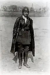 ![Document papier où figure sur la partie gauche la certification que « Mme Bessie Coleman, né[e] à Atlanta, Texas, le 20 janvier 1896, ayant rempli toutes les conditions imposées par la F.A.I a été breveté Pilote-Aviateur à la date du 15 juin 1921. » Sur la partie droite figure la photographie d'une femme en gros plan portant un casque d'aviateur, en dessous de laquelle apparaît la signature de Bessie Coleman ainsi que le numéro du brevet : 13810.](../I/Coleman-licens.jpg.webp)