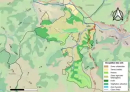 L'occupation des sols de la commune, telle qu'elle ressort de la base de données européenne d’occupation biophysique des sols Corine Land Cover (CLC), est marquée par l'importance des territoires agricoles (68 % en 2018), néanmoins en diminution par rapport à 1990 (73,5 %). La répartition détaillée en 2018 est la suivante : zones agricoles hétérogènes (43,1 %), forêts (25,7 %), prairies (21,2 %), terres arables (3,7 %), milieux à végétation arbustive et/ou herbacée (2,5 %), zones industrielles ou commerciales et réseaux de communication (1,9 %), mines, décharges et chantiers (1,8 %)[28].
