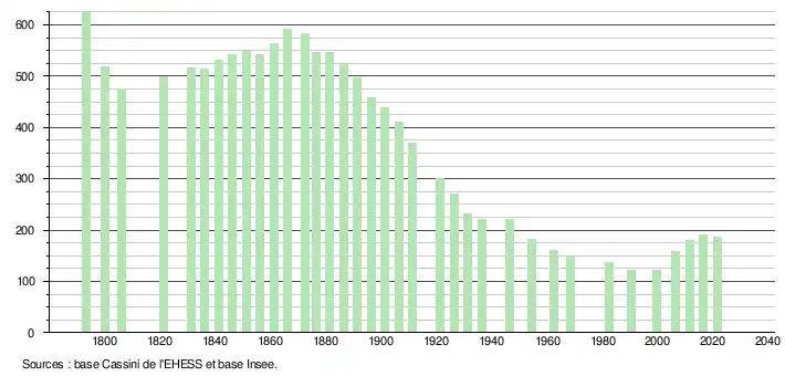 L'évolution du nombre d'habitants est connue à travers les recensements de la population effectués dans la commune depuis 1793. Pour les communes de moins de 10 000 habitants, une enquête de recensement portant sur toute la population est réalisée tous les cinq ans, les populations légales des années intermédiaires étant quant à elles estimées par interpolation ou extrapolation[16]. Pour la commune, le premier recensement exhaustif entrant dans le cadre du nouveau dispositif a été réalisé en 2006[17].