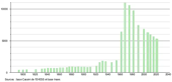 L'évolution du nombre d'habitants est connue à travers les recensements de la population effectués dans la commune depuis 1793. Pour les communes de moins de 10 000 habitants, une enquête de recensement portant sur toute la population est réalisée tous les cinq ans, les populations légales des années intermédiaires étant quant à elles estimées par interpolation ou extrapolation[27]. Pour la commune, le premier recensement exhaustif entrant dans le cadre du nouveau dispositif a été réalisé en 2005[28].