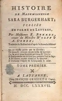 En 1782, elles surprirent les lecteurs avec l’Historie van mejuffrouw Sara Burgerhart (L'Histoire de mademoiselle Sara Burgerhart), un roman en deux parties sous forme de correspondance[8]. Dans ce premier roman épistolaire original néerlandais, la jeune Sara explore les limites de sa liberté[9]. Il reste difficile de savoir si cet ouvrage, qui donne avant tout un cours pédagogique aux jeunes filles et qui ne s'inscrit apparemment pas dans la tradition néerlandaise de romans, avait été inspiré par des exemples en langues étrangères, tels que ceux de Richardson et de Gellert. Le travail obtint de toute façon un grand succès. Sauf des fins éducatives, les auteures du roman avaient des objectifs économiques, patriotiques et religieux : les échanges commerciaux nationaux et un christianisme pratique et tolérante y sont glorifiés[8]. Après ce grand succès, le couple littéraire perdit sa quiétude : Wolff se plaignait incessamment du fait que son travail littéraire était constamment perturbé par des admirateurs indiscrets voulant voir travailler les deux amies dans leur cabane[9].