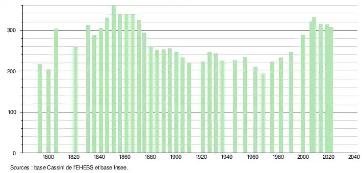 L'évolution du nombre d'habitants est connue à travers les recensements de la population effectués dans la commune depuis 1793. Pour les communes de moins de 10 000 habitants, une enquête de recensement portant sur toute la population est réalisée tous les cinq ans, les populations légales des années intermédiaires étant quant à elles estimées par interpolation ou extrapolation[16]. Pour la commune, le premier recensement exhaustif entrant dans le cadre du nouveau dispositif a été réalisé en 2008[17].