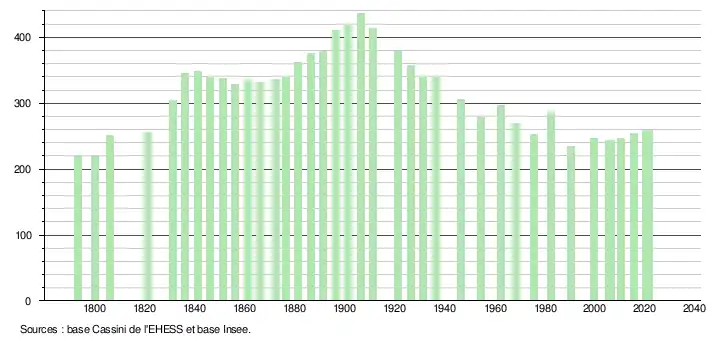 L'évolution du nombre d'habitants est connue à travers les recensements de la population effectués dans la commune depuis 1793. Pour les communes de moins de 10 000 habitants, une enquête de recensement portant sur toute la population est réalisée tous les cinq ans, les populations légales des années intermédiaires étant quant à elles estimées par interpolation ou extrapolation[28]. Pour la commune, le premier recensement exhaustif entrant dans le cadre du nouveau dispositif a été réalisé en 2005[29].