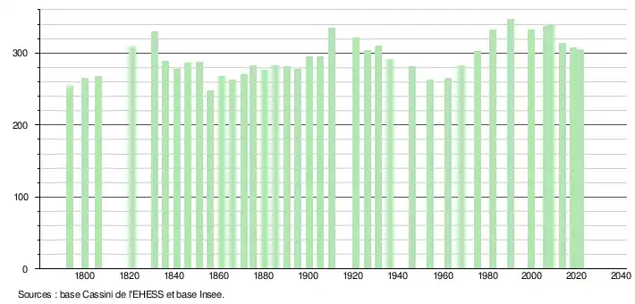 L'évolution du nombre d'habitants est connue à travers les recensements de la population effectués dans la commune depuis 1793. Pour les communes de moins de 10 000 habitants, une enquête de recensement portant sur toute la population est réalisée tous les cinq ans, les populations légales des années intermédiaires étant quant à elles estimées par interpolation ou extrapolation[21]. Pour la commune, le premier recensement exhaustif entrant dans le cadre du nouveau dispositif a été réalisé en 2008[22].