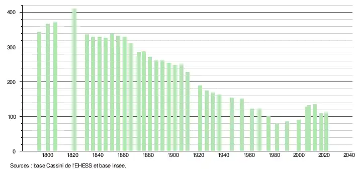 L'évolution du nombre d'habitants est connue à travers les recensements de la population effectués dans la commune depuis 1793. Pour les communes de moins de 10 000 habitants, une enquête de recensement portant sur toute la population est réalisée tous les cinq ans, les populations légales des années intermédiaires étant quant à elles estimées par interpolation ou extrapolation[15]. Pour la commune, le premier recensement exhaustif entrant dans le cadre du nouveau dispositif a été réalisé en 2007[16].