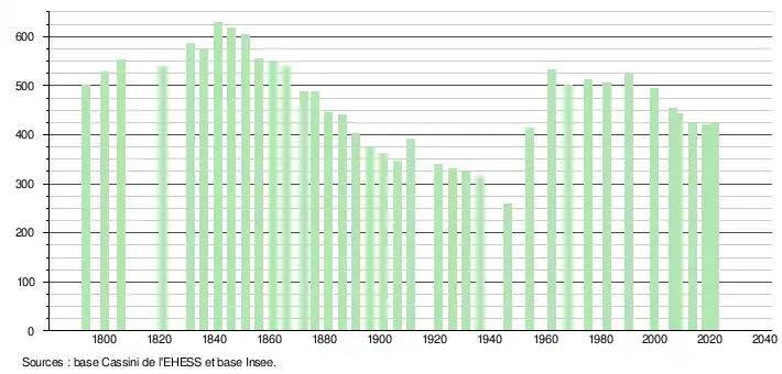 L'évolution du nombre d'habitants est connue à travers les recensements de la population effectués dans la commune depuis 1793. Pour les communes de moins de 10 000 habitants, une enquête de recensement portant sur toute la population est réalisée tous les cinq ans, les populations légales des années intermédiaires étant quant à elles estimées par interpolation ou extrapolation[17]. Pour la commune, le premier recensement exhaustif entrant dans le cadre du nouveau dispositif a été réalisé en 2008[18].