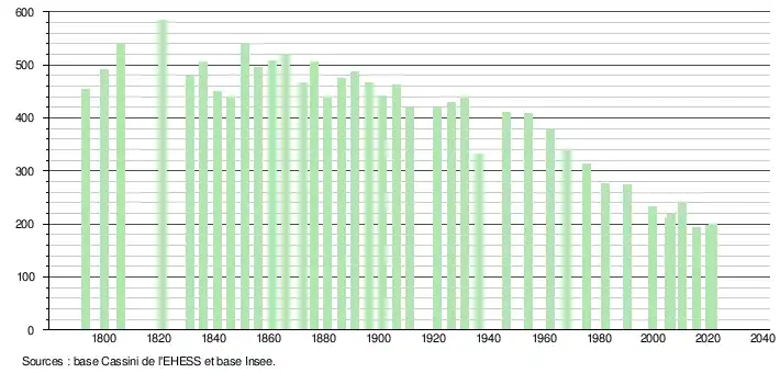 L'évolution du nombre d'habitants est connue à travers les recensements de la population effectués dans la commune depuis 1793. Pour les communes de moins de 10 000 habitants, une enquête de recensement portant sur toute la population est réalisée tous les cinq ans, les populations légales des années intermédiaires étant quant à elles estimées par interpolation ou extrapolation[21]. Pour la commune, le premier recensement exhaustif entrant dans le cadre du nouveau dispositif a été réalisé en 2005[22].