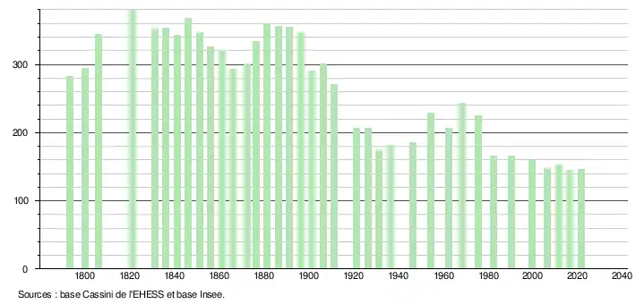 L'évolution du nombre d'habitants est connue à travers les recensements de la population effectués dans la commune depuis 1793. Pour les communes de moins de 10 000 habitants, une enquête de recensement portant sur toute la population est réalisée tous les cinq ans, les populations légales des années intermédiaires étant quant à elles estimées par interpolation ou extrapolation[31]. Pour la commune, le premier recensement exhaustif entrant dans le cadre du nouveau dispositif a été réalisé en 2006[32].