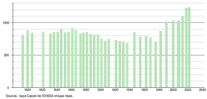 L'évolution du nombre d'habitants est connue à travers les recensements de la population effectués dans la commune depuis 1793. Pour les communes de moins de 10 000 habitants, une enquête de recensement portant sur toute la population est réalisée tous les cinq ans, les populations légales des années intermédiaires étant quant à elles estimées par interpolation ou extrapolation[20]. Pour la commune, le premier recensement exhaustif entrant dans le cadre du nouveau dispositif a été réalisé en 2007[21].