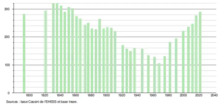 L'évolution du nombre d'habitants est connue à travers les recensements de la population effectués dans la commune depuis 1793. Pour les communes de moins de 10 000 habitants, une enquête de recensement portant sur toute la population est réalisée tous les cinq ans, les populations légales des années intermédiaires étant quant à elles estimées par interpolation ou extrapolation[26]. Pour la commune, le premier recensement exhaustif entrant dans le cadre du nouveau dispositif a été réalisé en 2006[27].