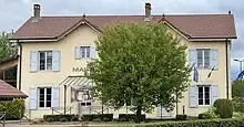 - Le bâtiment de la mairie qui accueillait aussi l'école jusqu'en 1970 fut construit en 1876 avec le mur d'enceinte par l'architecte Pinchard[30]. Contrairement aux autres bâtiments, celui-ci n'est pas situé au bourg du village.