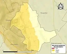 Le retrait-gonflement des sols argileux est susceptible d'engendrer des dommages importants aux bâtiments en cas d’alternance de périodes de sécheresse et de pluie[28]. 62,1 % de la superficie communale est en aléa moyen ou fort (59 % au niveau départemental et 48,5 % au niveau national)[Carte 3]. Depuis le , en application de la loi ELAN, différentes contraintes s'imposent aux vendeurs, maîtres d'ouvrages ou constructeurs de biens situés dans une zone classée en aléa moyen ou fort[Note 5],[29].