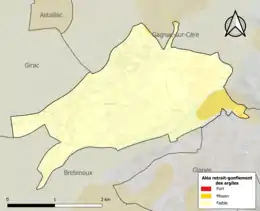 Le retrait-gonflement des sols argileux est susceptible d'engendrer des dommages importants aux bâtiments en cas d’alternance de périodes de sécheresse et de pluie. 4,9 % de la superficie communale est en aléa moyen ou fort (67,7 % au niveau départemental et 48,5 % au niveau national). Sur les 903 bâtiments dénombrés sur la commune en 2019, 0 sont en aléa moyen ou fort, soit 0 %, à comparer aux 72 % au niveau départemental et 54 % au niveau national. Une cartographie de l'exposition du territoire national au retrait gonflement des sols argileux est disponible sur le site du BRGM[27],[Carte 2].