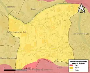 Le retrait-gonflement des sols argileux est susceptible d'engendrer des dommages importants aux bâtiments en cas d’alternance de périodes de sécheresse et de pluie[22]. La totalité de la commune est en aléa moyen ou fort (91,8 % au niveau départemental et 48,5 % au niveau national)[Carte 2]. Depuis le , en application de la loi ELAN, différentes contraintes s'imposent aux vendeurs, maîtres d'ouvrages ou constructeurs de biens situés dans une zone classée en aléa moyen ou fort[Note 4],[23].