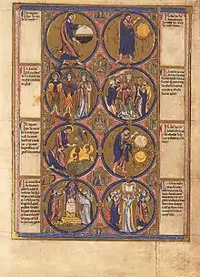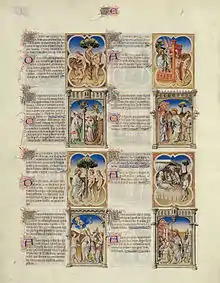 - la Bible moralisée napolitaine, une bible commandée par Robert Ier de Naples et achevée vers 1350, actuellement conservée à la BNF (Fr.9561)[8]