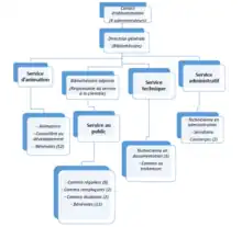 Il y a aussi un service administratif dans lequel on retrouve une technicienne en administration, une agente de bureau et de communication ainsi que 2 concierges. Sauf pour le service au public, qui relève de la bibliothécaire adjointe, tous les autres services relèvent de la directrice générale, soit une bibliothécaire. Cette dernière est subordonnée à un conseil d’administration formé de 9 personnes.