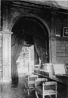 Installée au premier étage de l'ancienne chapelle, la bibliothèque prend la forme d'une croix latine longue d'environ 48 m sur 26 m (149 pieds de long sur 80 de large) [8] divisée en trois salles[9] abritant les quelque 25 000 volumes de la collection. En 1858, la municipalité décide d'agrandir la bibliothèque en construisant un nouveau bâtiment dans la continuité de l'ancienne chapelle[10].