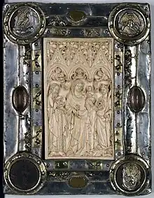 Plat supérieur de la reliure de l'Évangéliaire pourpre - L'Évangéliaire pourpre[7] (MS 265 P/R) est un manuscrit daté du IXe siècle appartenant alors au chapitre d'Épinal. Il se caractérise par une précieuse reliure de métaux et d'ivoire, des feuillets de parchemin pourpré écrit avec de l'or, et de deux miniatures du xve siècle réalisées par le Maître de Saint-Goery.