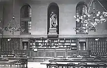 "Elle compte quatre-vingts places équipées de chaises paillées ou cannées et de solides tables en bois peintes en noir. Très aérée, très spacieuse pour l'époque, cette salle est dominée par une statue de Blaise Pascal. Le jour y pénètre en abondance par la verrière qui, pourvue d'un large vélum, protège des rayons du soleil estival. Les soirs d'hiver, six lustres électriques avec lampes à incandescence projettent leurs bienveillants rayons lumineux sur les lecteurs et le personnel[7]."