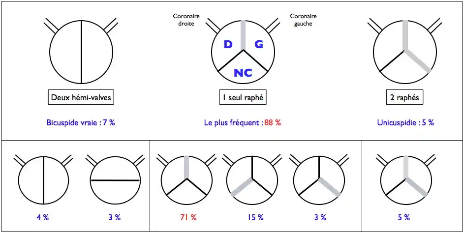 - exceptionnellement, les trois valves peuvent être fusionnées entre elles par deux raphés, donnant une unicuspidie aortique (5 % des cas).