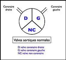 Normalement, l'appareil valvulaire aortique (séparant le ventricule gauche de l'aorte) est constitué de 3 valves sigmoïdes fermant chacune 1/3 de l'orifice (ces valves pouvant être légèrement inégales) :
