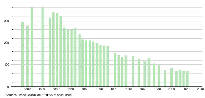 L'évolution du nombre d'habitants est connue à travers les recensements de la population effectués dans la commune depuis 1793. Pour les communes de moins de 10 000 habitants, une enquête de recensement portant sur toute la population est réalisée tous les cinq ans, les populations légales des années intermédiaires étant quant à elles estimées par interpolation ou extrapolation[16]. Pour la commune, le premier recensement exhaustif entrant dans le cadre du nouveau dispositif a été réalisé en 2006[17].