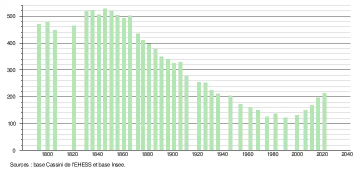 L'évolution du nombre d'habitants est connue à travers les recensements de la population effectués dans la commune depuis 1793. Pour les communes de moins de 10 000 habitants, une enquête de recensement portant sur toute la population est réalisée tous les cinq ans, les populations légales des années intermédiaires étant quant à elles estimées par interpolation ou extrapolation[15]. Pour la commune, le premier recensement exhaustif entrant dans le cadre du nouveau dispositif a été réalisé en 2006[16].