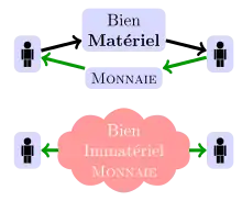 Certaines propositions de modèle économique[3] pour les biens immatériels suggèrent que pour satisfaire des exigences de justice et optimiser l'utilité du bien, il est requis que la fonction de prix procède au remboursement partiel des premiers acheteurs au fur et à mesure que de nouveaux acheteurs arrivent et que dans un même temps le revenu cumulé tiré de la vente soit toujours une fonction croissante dans le temps. L'application d'un principe d'équité aux biens immatériels multiplie le nombre de calculs des transactions commerciales (voir figure) et pousse à utiliser une monnaie internationale[4] dédiée aux biens immatériels afin de fournir une recette fiscale sans subir une prise de commission par le système bancaire privé. Ce système économique est fondé sur le partage marchand[5].