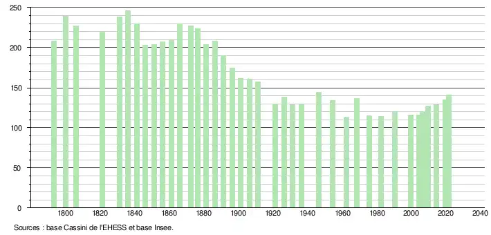 L'évolution du nombre d'habitants est connue à travers les recensements de la population effectués dans la commune depuis 1793. Pour les communes de moins de 10 000 habitants, une enquête de recensement portant sur toute la population est réalisée tous les cinq ans, les populations légales des années intermédiaires étant quant à elles estimées par interpolation ou extrapolation[20]. Pour la commune, le premier recensement exhaustif entrant dans le cadre du nouveau dispositif a été réalisé en 2004[21].