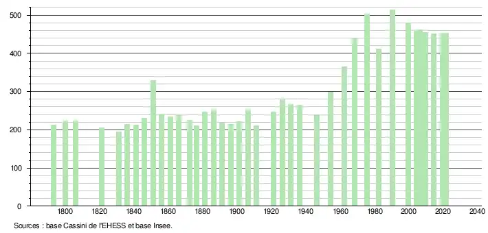L'évolution du nombre d'habitants est connue à travers les recensements de la population effectués dans la commune depuis 1793. Pour les communes de moins de 10 000 habitants, une enquête de recensement portant sur toute la population est réalisée tous les cinq ans, les populations légales des années intermédiaires étant quant à elles estimées par interpolation ou extrapolation[44]. Pour la commune, le premier recensement exhaustif entrant dans le cadre du nouveau dispositif a été réalisé en 2004[45].