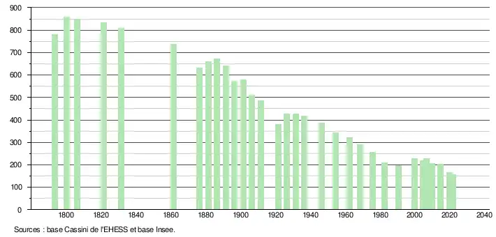 L'évolution du nombre d'habitants est connue à travers les recensements de la population effectués dans la commune depuis 1793. Pour les communes de moins de 10 000 habitants, une enquête de recensement portant sur toute la population est réalisée tous les cinq ans, les populations légales des années intermédiaires étant quant à elles estimées par interpolation ou extrapolation[21]. Pour la commune, le premier recensement exhaustif entrant dans le cadre du nouveau dispositif a été réalisé en 2004[22].