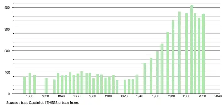 L'évolution du nombre d'habitants est connue à travers les recensements de la population effectués dans la commune depuis 1793. Pour les communes de moins de 10 000 habitants, une enquête de recensement portant sur toute la population est réalisée tous les cinq ans, les populations légales des années intermédiaires étant quant à elles estimées par interpolation ou extrapolation[18]. Pour la commune, le premier recensement exhaustif entrant dans le cadre du nouveau dispositif a été réalisé en 2005[19].