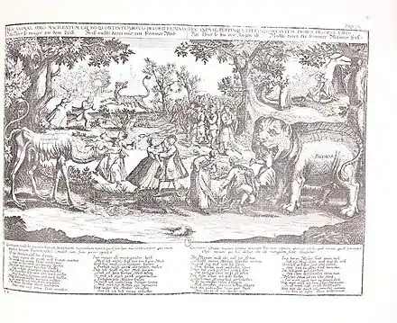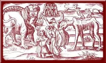 En Angleterre, une gravure sur bois, d'un travail grossier et exécutée sous le règne d'Élisabeth, où se montrent encore les deux bêtes fantastiques, également reconnaissables, l'une à son état de dépérissement piteux, l'autre à son obésité envahissante ; Chicheface s'appelle Pinch-Belly, c'est-à-dire Ventre-Creux, et Bigorne, Fill-Gult (Boyaux Pleins}[10]. Cette légende existerait aussi en Hollande et en Allemagne.