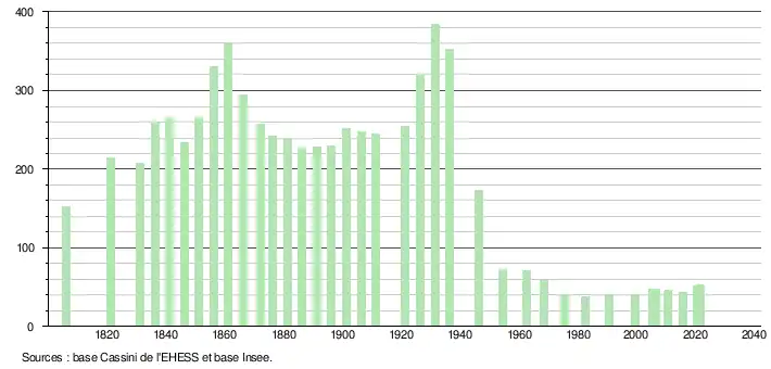 L'évolution du nombre d'habitants est connue à travers les recensements de la population effectués dans la commune depuis 1806. Pour les communes de moins de 10 000 habitants, une enquête de recensement portant sur toute la population est réalisée tous les cinq ans, les populations légales des années intermédiaires étant quant à elles estimées par interpolation ou extrapolation[9]. Pour la commune, le premier recensement exhaustif entrant dans le cadre du nouveau dispositif a été réalisé en 2005[10].