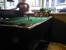 Le billard de pub se pratique à plusieurs joueurs sur une table recouverte de tissu et bordée de bandes, sur laquelle on fait rouler des billes que l’on frappe à l’aide d’une queue. La table mesure 71 centimètres de long et ne possède pas de poches latérales ou dans les coins : celles-ci se répartissent sur la surface de jeu (huit poches en tout). Chaque poche se voit attribuer un nombre de points allant de 10 à 200.