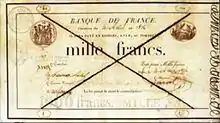 - Le 1 000 francs 1800 fut imité semble-t-il quelque temps après son lancement : la date du 10 frimaire de l’An III est erronée elle devrait être du 2 messidor de l’An VIII (). Le papier est très fin, il ne comporte pas de filigrane en clair mais seulement des caractères imprimés en gris pour simuler celui-ci[6].