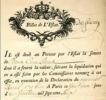« […] Billets qui ont commencé presque en même tems que le regne de Louis XV pour acquitter les dettes immenses contractées sous le regne précédent. Ces dettes qui montoient à plusieurs centaines de millions ayant été payées en partie par divers moyens, le roi les réduisit à un capital de 250 millions, qu'il se chargea de payer, & en fit, pour ainsi dire, ses billets aux intéressés. Ces nouveaux billets furent appelés billets de l'état; par ce que le roi en fit sa dette, & qu'il promit de les payer sur les revenus de l'état; au lieu qu'auparavant ce n'étoient que des billets de particuliers, quoique faits pour des sommes fournies pour les besoins de l'état. La plûpart de ces billets ont été depuis retirés, soit en taxes sur les gens d'affaire, soit en actions de la compagnie d'occident, soit en rentes viageres sur l'hôtel de ville de Paris, soit enfin par des loteries qui s'y tiroient tous les mois. »