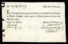Mise à part la monnaie de carte canadienne, assimilable à une monnaie-papier de nécessité, la première tentative de véritable billet de banque français fut initiée par John Law de Lauriston qui, au début du XVIIIe siècle, hérite des échecs financiers des précédentes politiques financières du Royaume. Ces billets sont exprimés en livres tournois, alors la monnaie de l'Ancien Régime, qui fut remplacée un siècle plus tard par le franc.
