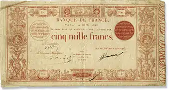 - le 5 000 francs émis en 1846 et qui est imprimé à l'encre rouge ;