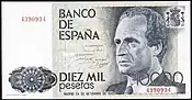 10000 Ptas | 165 × 85 mm | Gris | Juan Carlos Ier d'Espagne | Felipe Prince de Asturies; l'Escurial; et texte manuscrit signé du Prince de Asturies : "... que todos y cada uno, desde el puesto que nos corresponde, podamos cumplir nuestra misión en la paz, en la libertad y en la justicia, para el engrandecimiento de nuestra Patria." |